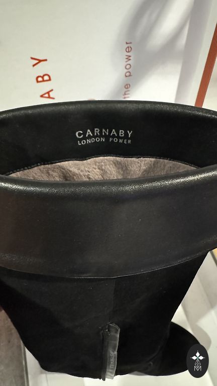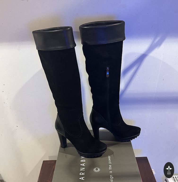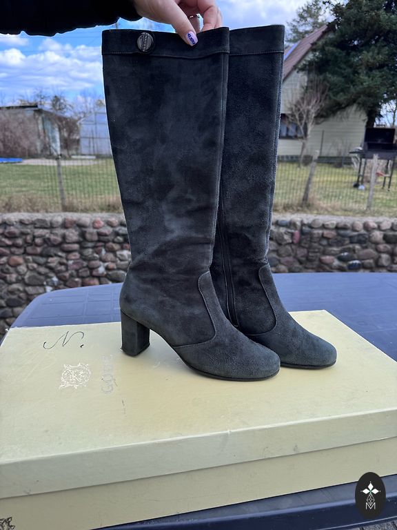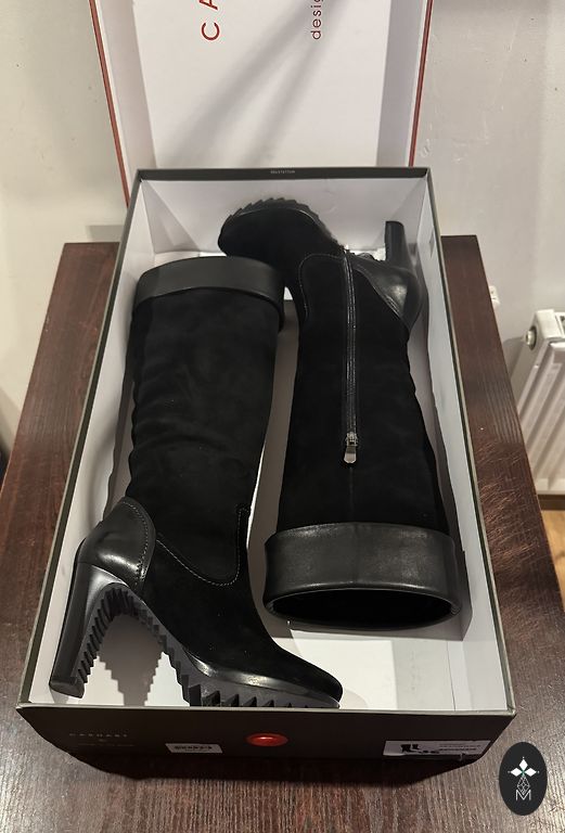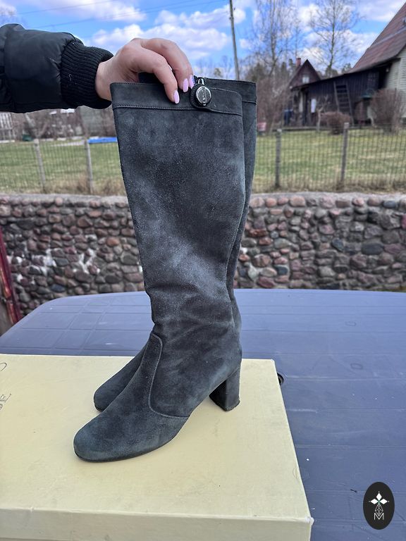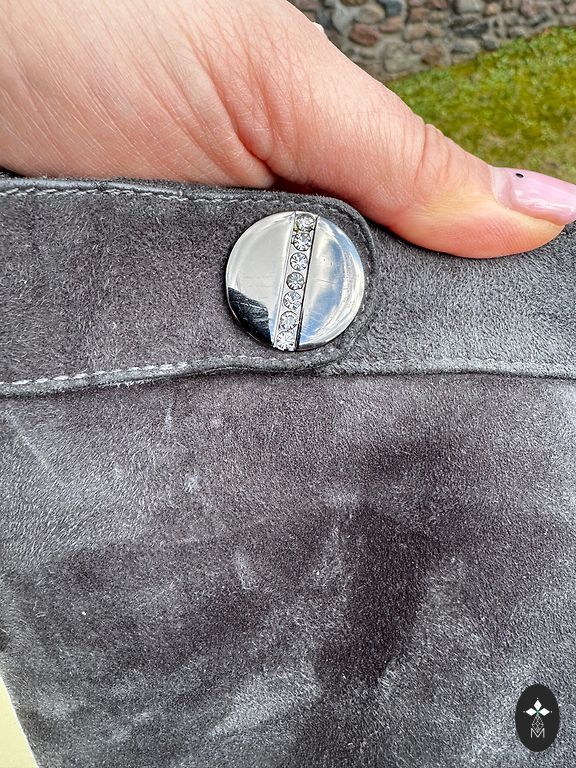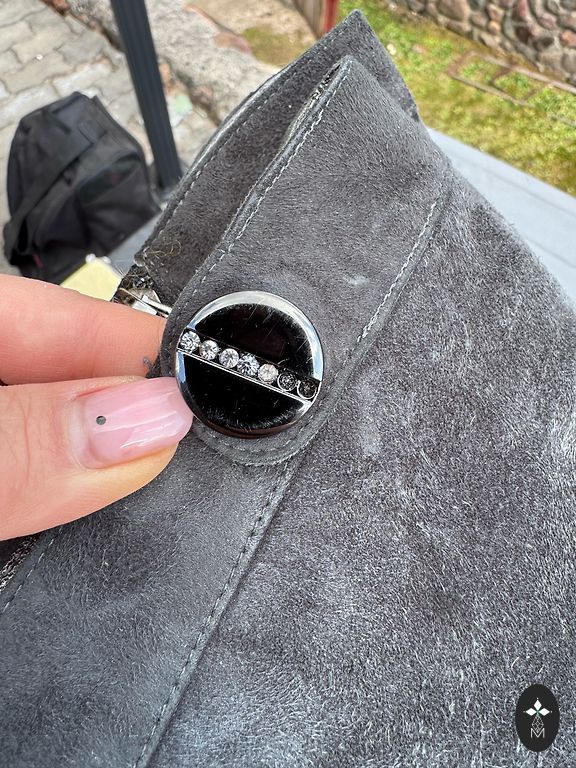New, never worn. Fabric similar to suede, but I have no idea if it is suede or not. Inside zipper ~25 cm.