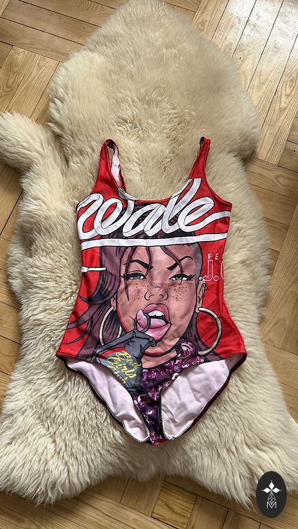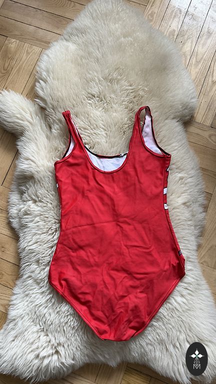Diskreetne, suvine ujumistrikoo. Nähtavaid defekte ei leidnud, ainult kantud, seega märgin "heas korras". Suurus on märgitud S, aga arvan, et sobib paremini M-le. Koostis: 85% polüester, 15% elastaan.