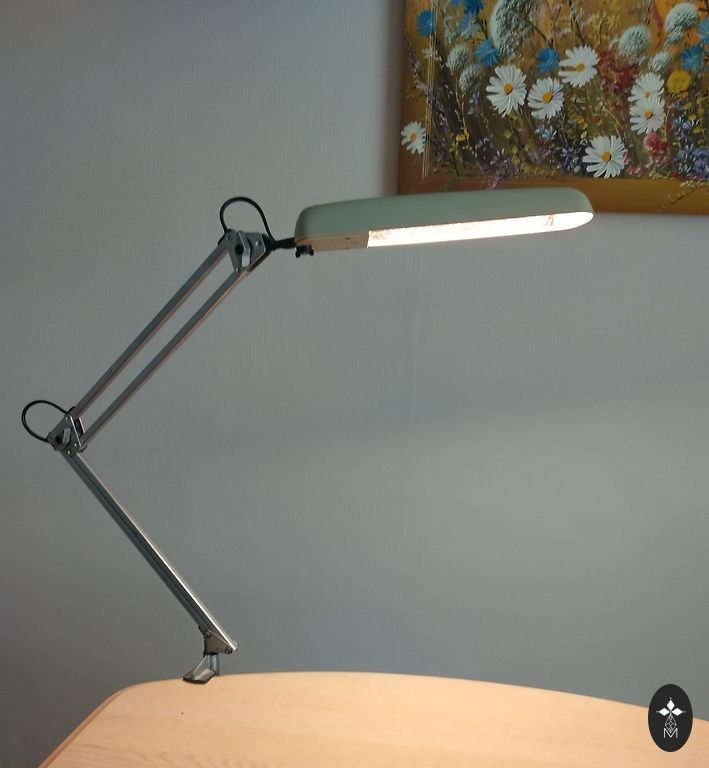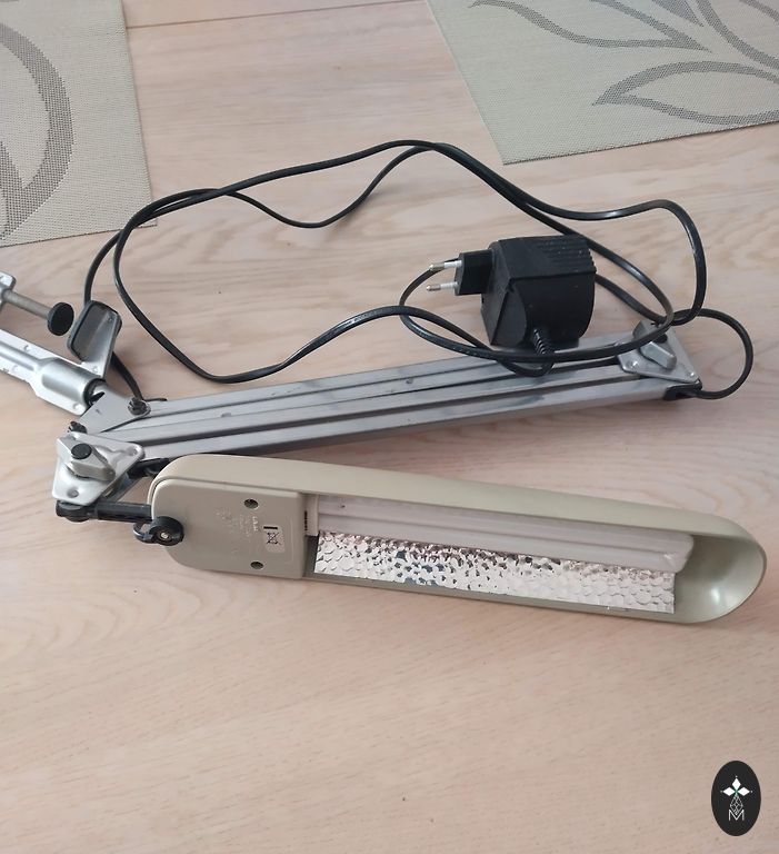 Suomijos gamybos stalinė lempa, reguliuojama, sulankstoma, pasukama skirtingais kampais, ekonomiška, sunaudoja tik 11w, veikia. Siuntimą apmoka pirkėjas.