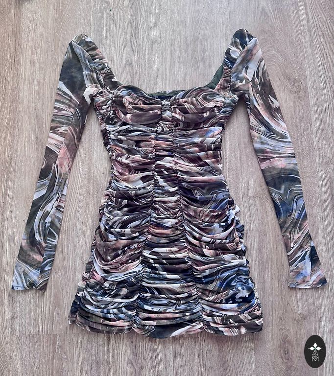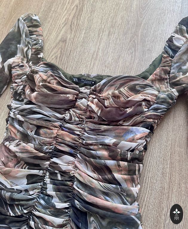 Worn once to a friend's wedding. Color is blue-green, depending on the light. Size is not written on the tag, but it will fit a size 38.