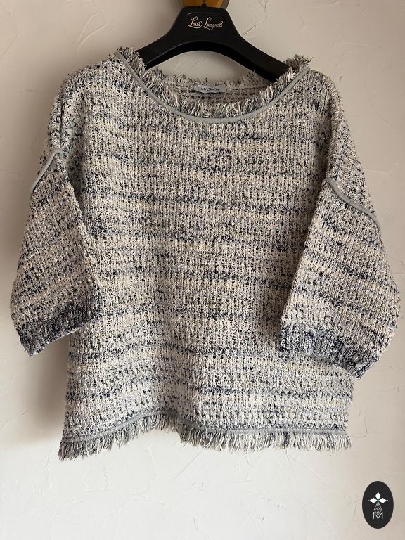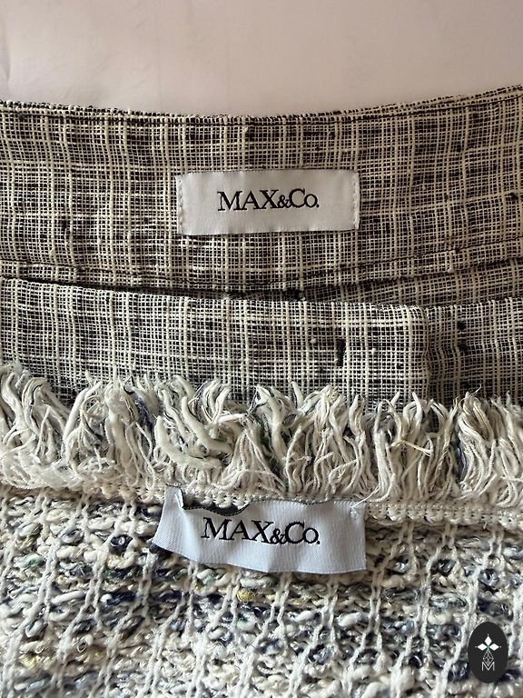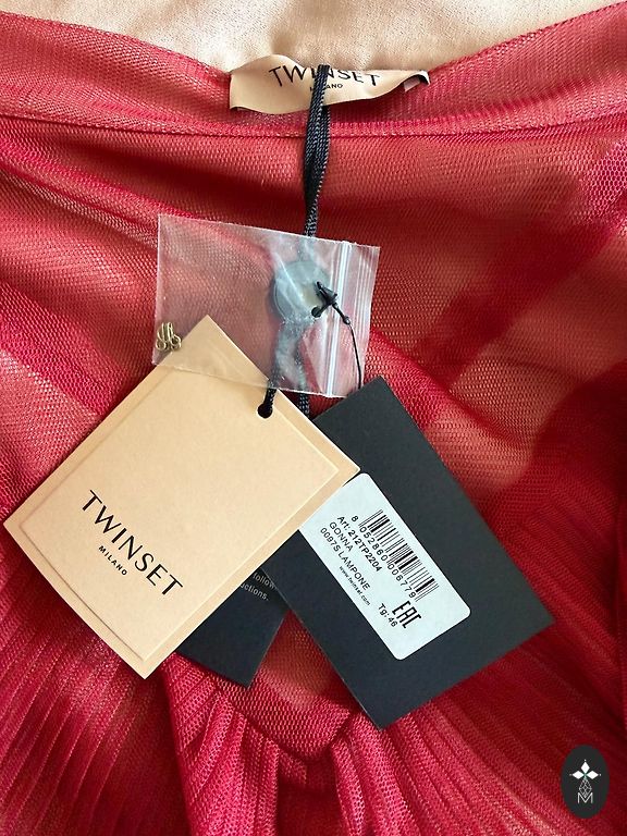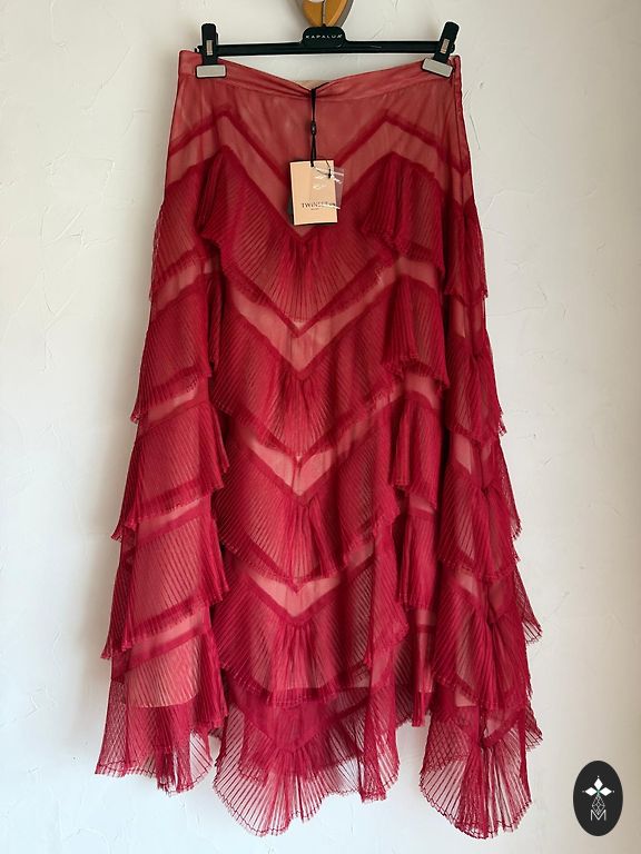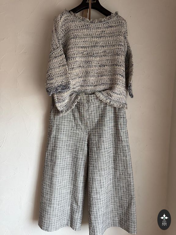 The set is knitted in cotton and cashmere. The vest is size M, chest 86 cm, length 60cm. The skirt is size S, waist 74 cm (stretches a little), length 54 cm.