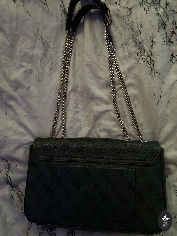 GUESS - Talpi ir patogi rankinė, daug skyrių, matmenys: 30 cm pločio, 22 cm aukščio. Sidabrinės spalvos furnitūra. Geros būklės, tačiau yra nedidelių nusidėvėjimų (apatinė rankinės kraštinė ir rankenos), kurie nėra labai matomi (4 ir 5 nuotrauka). Spalva - pilka su mėlyna. Originali, pirkta JAV.