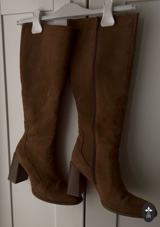 FIORE – tamsiai rudi, patogūs suede batai, dydis 39, vidinis padas 25 cm, kulno aukštis 7 cm, ilgis 42 cm, viršutinio krašto apimtis 38 cm.