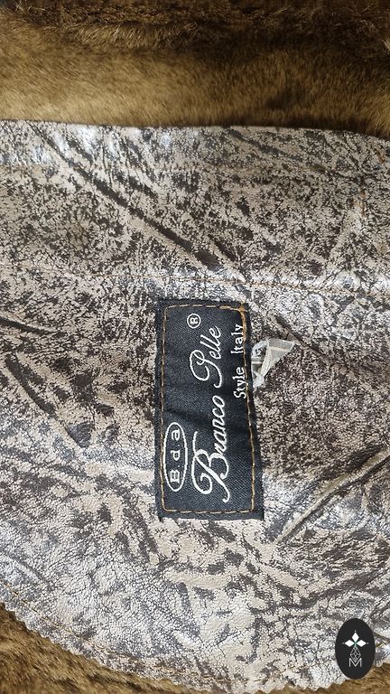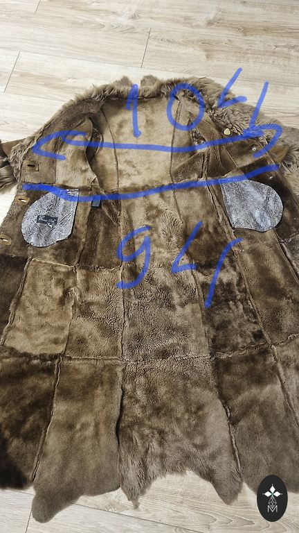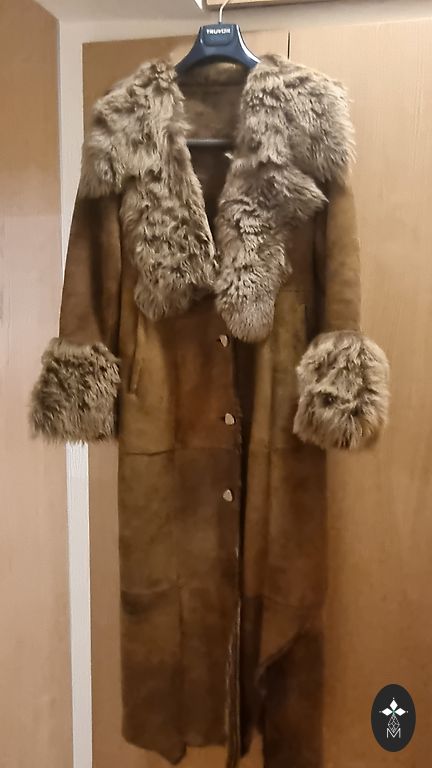A very beautiful and light coat with a rich collar. There are pockets on the side seams and an inside pocket. Length 111 cm.