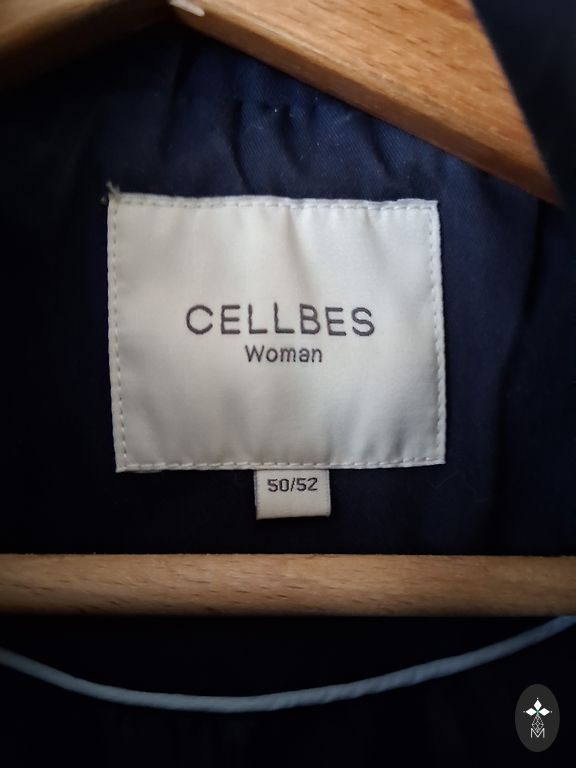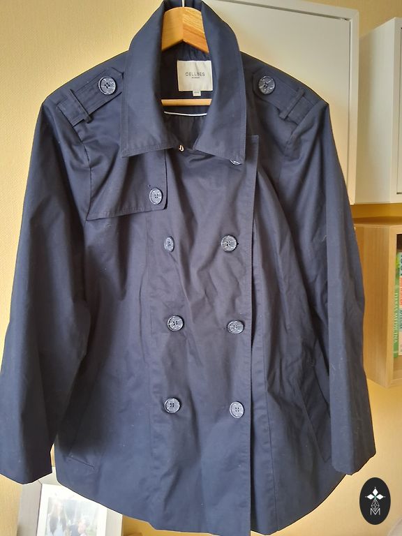 Graži, tamsiai mėlyna spalva su smėlio spalvos apvadu rankovių galuose ir ant apykaklės.