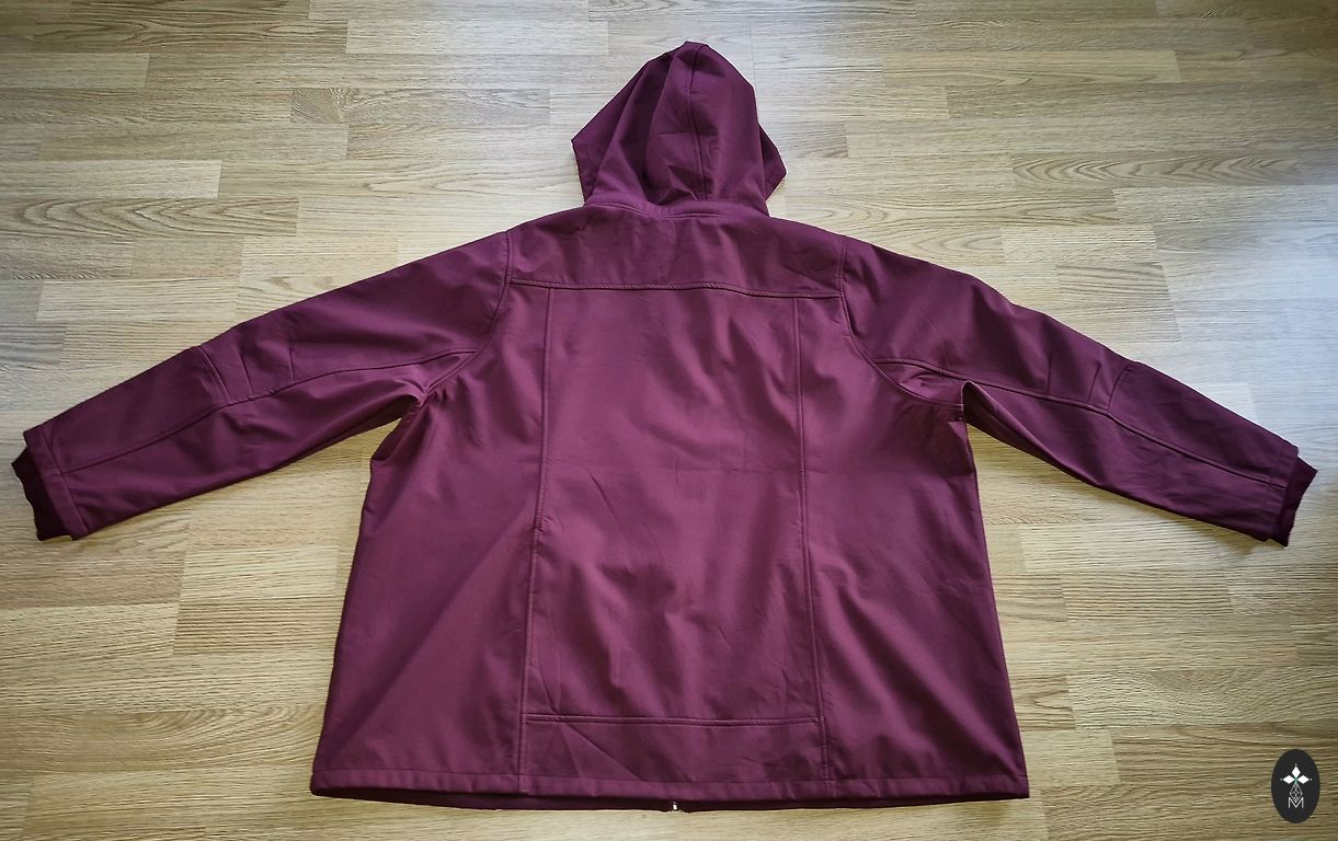 Jacket with lining (without insulation), has a hood, pockets, adjustable in the middle, sleeves can be rolled up and secured. Excellent for unexpected summer rain, hiking, or cooler evenings. Beautiful dark sky color. Size UK 20 or European 48. Measurements: chest up to 120 cm, hips 124 cm. Length 77 cm, raglan sleeves, so measurement from neck opening 79 cm, from underarm 51 cm.