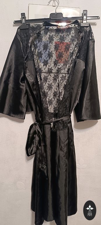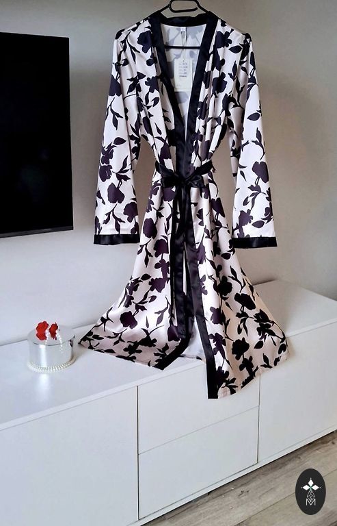 Kahepoolne hommikuseelik vööga. Pikkus 126 cm, varrukad 3/4 pikkuses. Paks siid. Mõlemal küljel on taskud. Väga meeldiv nahale. Näeb hea välja. Sobib kuni 112 cm puusade ümbermõõdule.