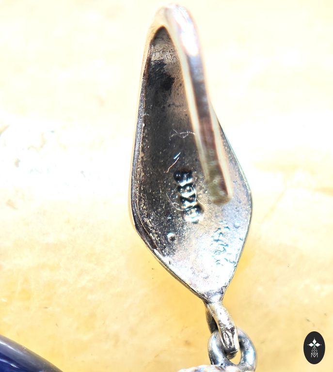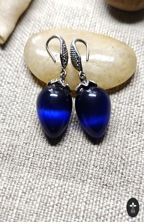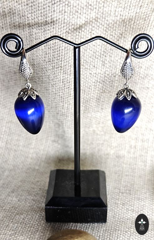 Sidabriniai auskarai, dydis: 3-2 cm. Topazas – laboratorijoje išaugintas, skatina intelektualinius ieškojimus ir dvasinį tobulėjimą, ramina nervų sistemą, padeda nuo nemigos ir streso, gerina kraujotaką, padeda nuo gripo ir peršalimo.