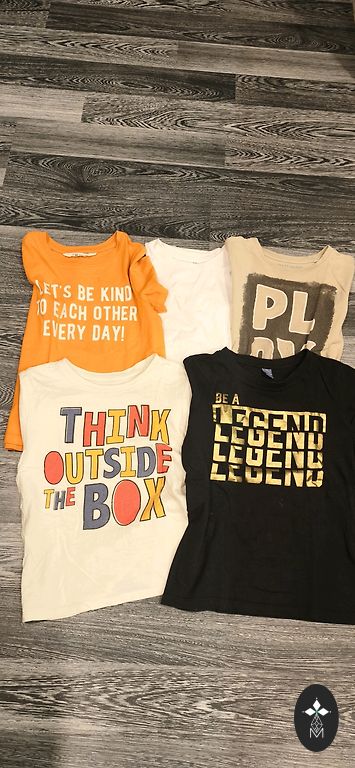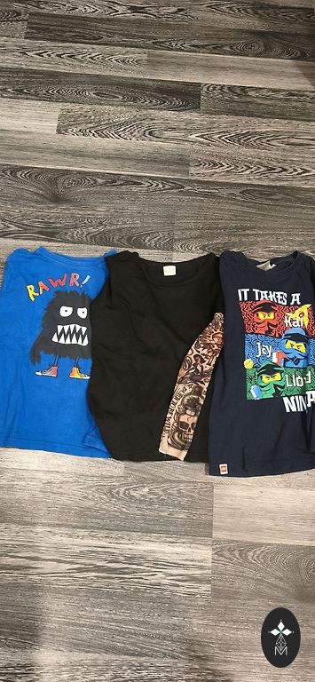 Üks särk ei ole kordagi kantud, pärast poest ostmist pestud. Teine särk kantud paar korda. Lühikesed püksid kantud. Suurused fotol.