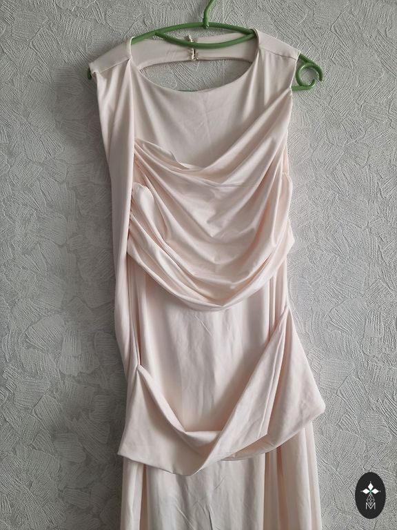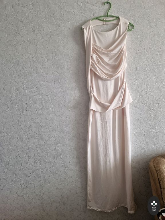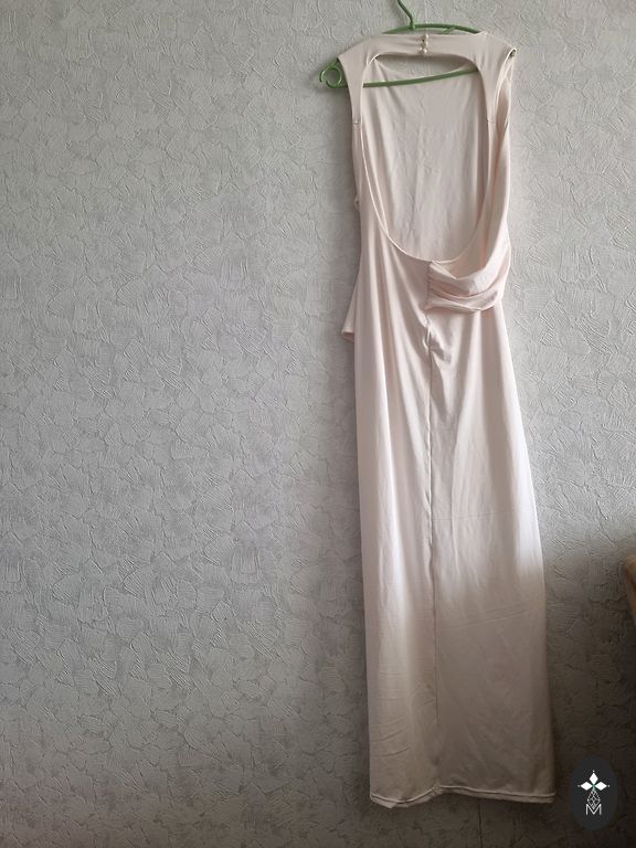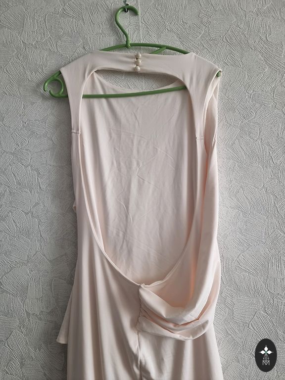 Fantastiškai graži vakarinė suknelė. Lengva, plazdanti medžiaga; sijonas iki žemės; pečiai uždengti, nugara atvira. Priekyje blizgantys kristalai.