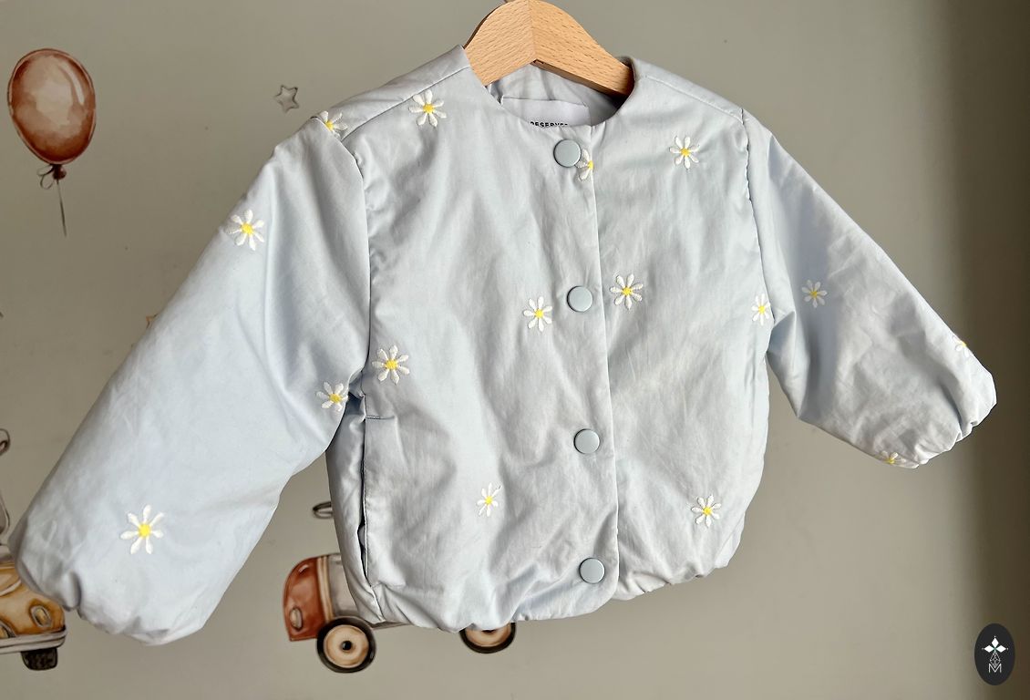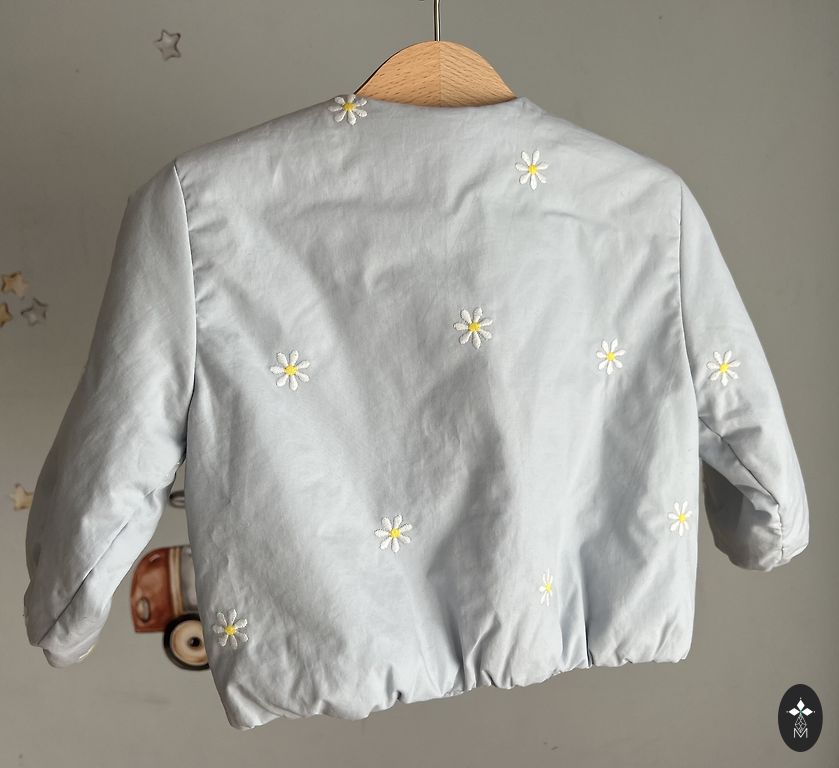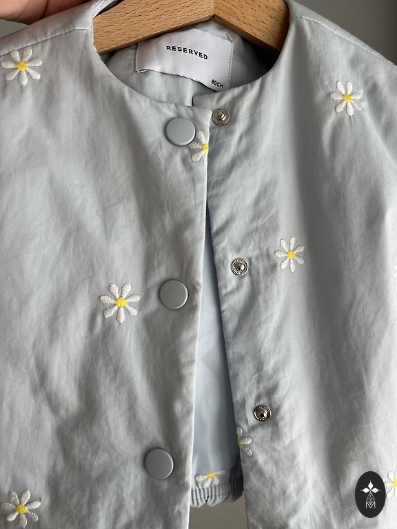 Šviesiai mėlynos spalvos striukė. Striukės ilgis, matuojant nuo viršutinės pečių dalies, yra 47 cm. Rankovių ilgis, matuojant nuo pečių dalies, yra 47 cm. Mažai dėvėta, geros būklės.