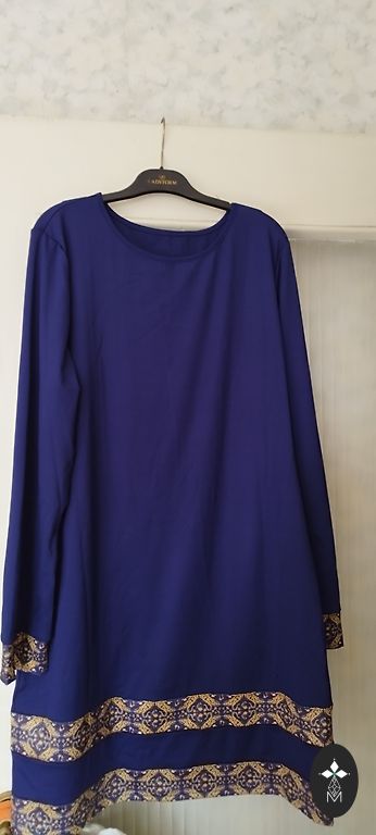 Elastic dress with lining, lowered waistline, tied with a string. Dress length 94 cm, sleeve length 61 cm. Width at bust 42 cm, at waist 40 cm, at shoulders 38 cm. Shipping costs are included in the price.