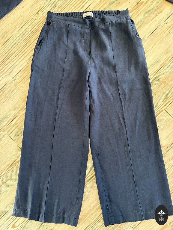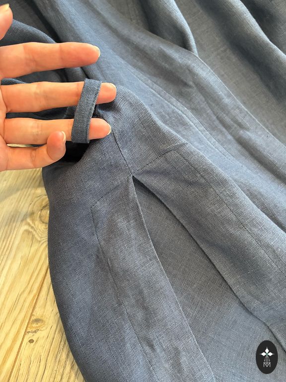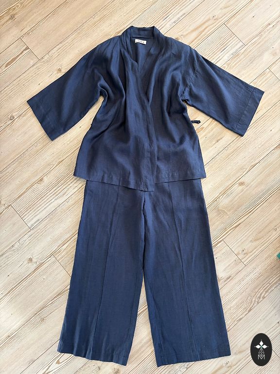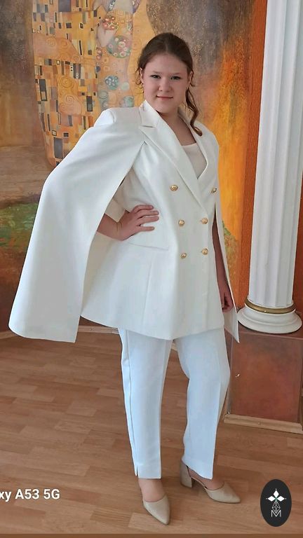 Divdaļīgs kostīms. Žakete ar gaiši zilu oderi, svārciņi bez oderes. Pleci- 41cm, piedurknes- 60cm, svārki viduklī- 43cm, svārku garums 35cm. Auduma sastāvs apskatāms foto.