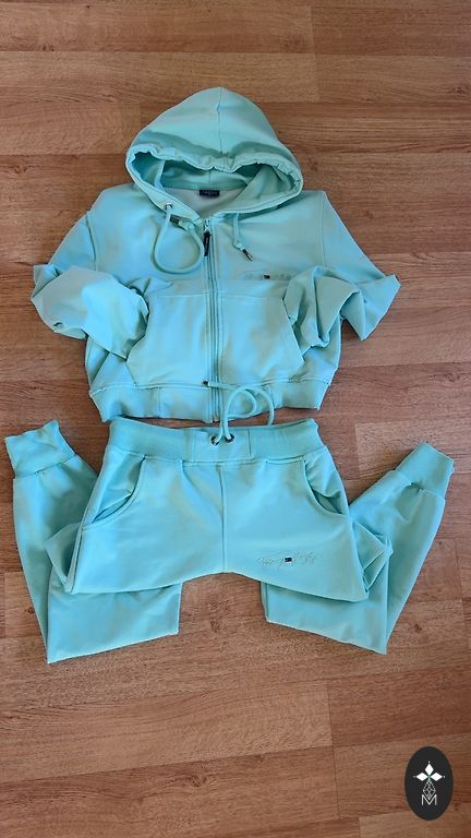 Elegantne türkiissinine spordikomplekt. Originaal. Puuvill. Pükstel on voodrita pits. Sweatshirtil on pitsi all läbipaistev vooder. Pükste ja sweatshirti toonid erinevad veidi. Hind on kogu komplekti eest. _____________