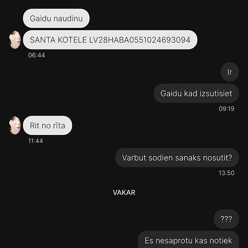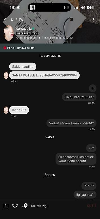 Pasūtīju 27. augustā, bet saņēmu 9. septembrī. Pārdevēja nratbildēja uz ziņām, pēc kāda laika tomēr teica, ka nosūtīs un atkal pazuda uz nedēļu. Nekādu atvainošanās vai paskaidrojumu.